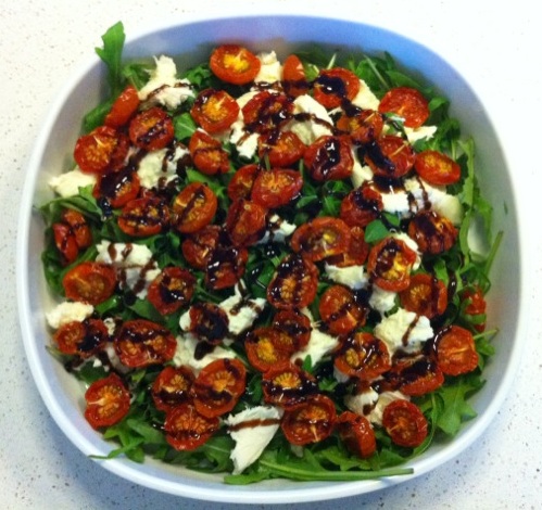 Skyl rucolaen og anret den fladt på et fad eller i en bred skål. Bræk mozzarellaen i rustikke stykker og fordel den over salaten og herefter alle tomaterne. Hæld tilsidst en balsamico dressing over – af den tykke art og slut af med friskkværnet salt og peber inden servering.