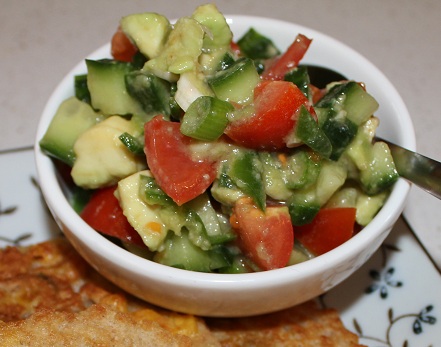 Skær avokado, tomater, agurk og forårsløg i små tern. Hak chili fint. Bland alle grøntsager og chili med hvidløg. Skal til med lime og salt. Serveres eksempelvis til majspandekager.
