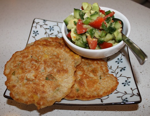 Pisk æg og mælk sammen og tilsæt melet lidt efter lidt. Piskes godt sammen til en glat dej – tykkere i konsistensen end almindelig pandekagedej. Tilsæt majs (har du friske kogte majs to skær disse af kolberne af 2-3 kolber), hakket koriander, cayennepeber og salt.