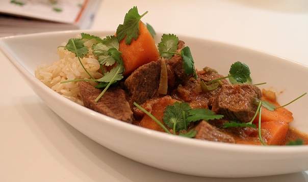 Hvis kødet indeholder en del sener, så rens det for dem og skær det i mundrette bider. Hak chili, hvidløg og ingefær fint. Steg kødet ved høj varme indtil alle sider har fået farve. Tag kødet fra gryden. Put hvidløg, chili og ingefær i gryden og steg det ved middelvarme (de må IKKE få farve eller branke) i ca. 2-3 minutter. Tilsæt de øvrige krydderier og steg/rist nogle minutter. Put kødet tilbage i gryden, hæld hakkede tomater og kokosmælk ved. Lad det simre 1-2 (måske 3) timer under låg. Skræl gulerødder og skær dem i terninger – hæld dem i gryden de sidste 10-15 minutter af kogetiden. Kog ris og server retten med ris, drysset med frisk koriander og eventuelt naan brød til.