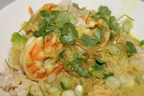 Hak 2 af løgene fint og riv de 2 andre. Varm olien i en gyde og tilsæt garam masala – steg det over lav varme i ca. 1 minut under omrøring. Tilsæt de hakkede løg og steg sagte i ca 8-10 minutter indtil de er gyldne/klare. Tilsæt de 2 sidste revne løg, gurkemeje, kanel, kardemomme frø, chili, nelliker og laubærblade og steg i 5 minutter – omrøres jævnligt. Tilsæt kokosmælk og lad det simre i 10 minutter. Smag til med salt. Tilsæt de pillede, rensede rejer og lad det simre i ca 5-6 minutter og rejerne er blevet lyserøde.
