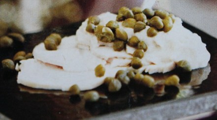 Server kalkunen skåret i fine skiver med tunsaucen ovenpå og kapers til sidst.